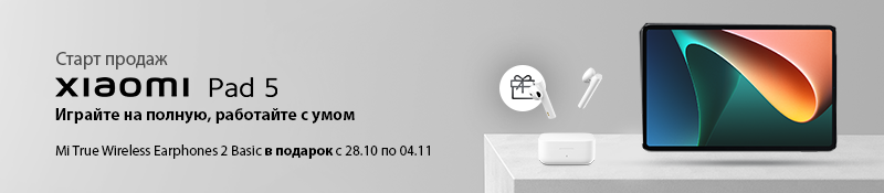 Одна из самых ожидаемых новинок осени — планшет Xiaomi Pad 5 уже в продаже. Планшет порадует Вас отличными характеристиками: дисплей WQHD+ 120 Гц, 4 динамика с эффектом погружения, процессор Qualcomm Snapdragon 860 и аккумулятор 8720 мАч. С 28 октября по 4 ноября первым покупателям мы дарим Mi True Wireless Earphones 2 Basic в подарок!